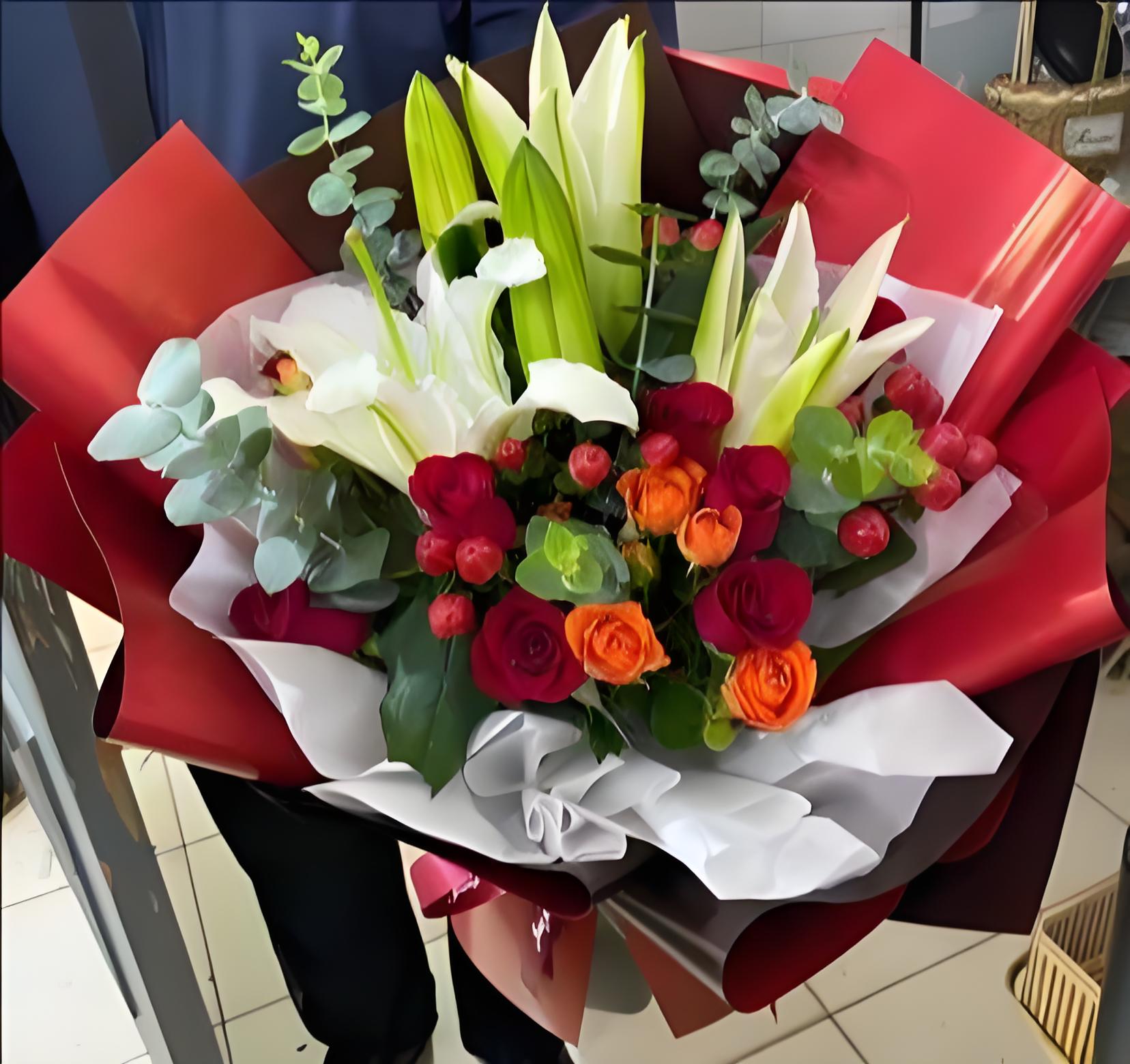 开封金明区花店包11枝红玫瑰、2枝多头白百合、6枝橙色多头玫瑰、红豆、尤加利叶
